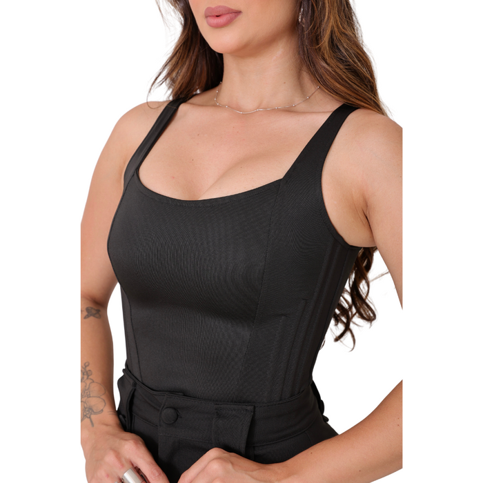 Com uma estrutura que valoriza a silhueta, ele possui caimento justo e ajustado ao corpo, realçando a cintura e proporcionando um visual poderoso e feminino. Perfeito para compor produções tanto casuais quanto mais refinadas, o corpete pode ser usado com calças de cintura alta, saias ou até sobre camisas, criando looks modernos e estilosos com facilidade.