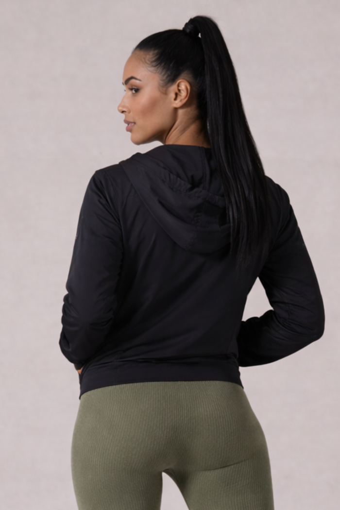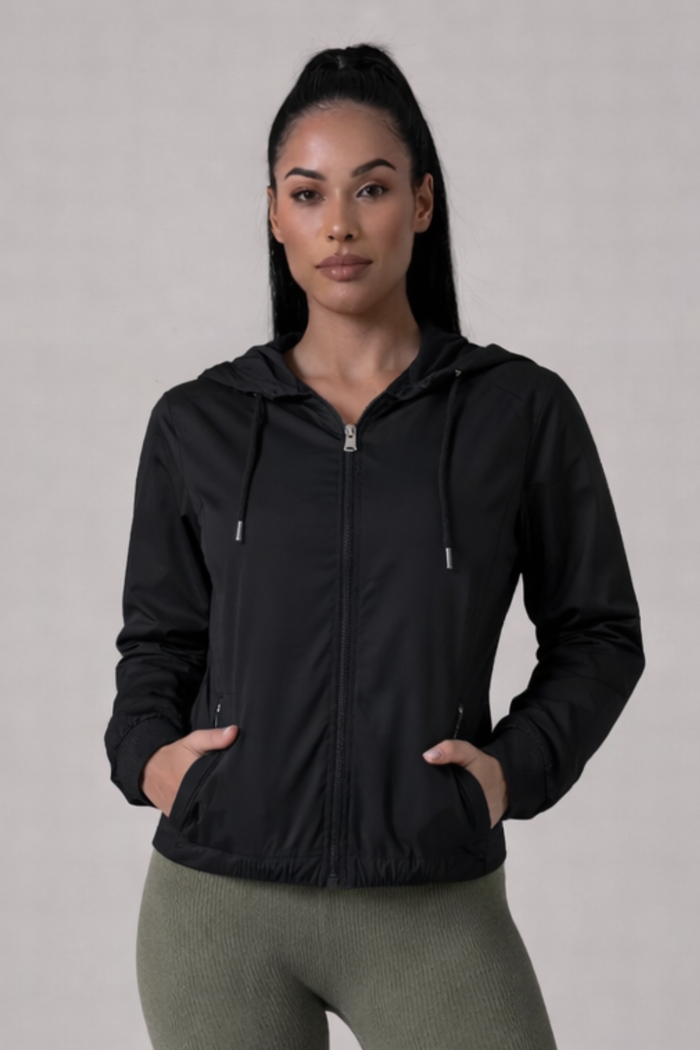 Jaqueta Corta Vento com Capuz e Bolso Feminina Impermeável Preta